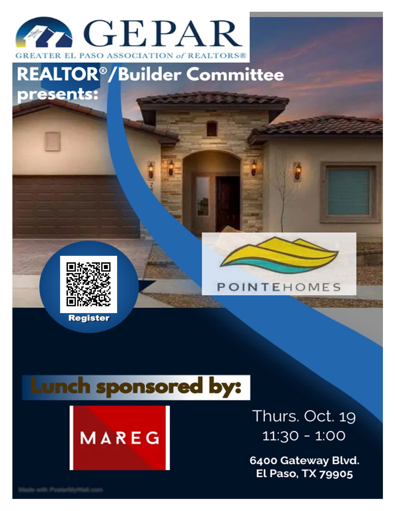 Presentation by Pointe Homes on Thursday, October 19, 2023, from 11:30 AM to 1:00 PM (MDT). This enlightening panel will discuss future projections for Pointe Homes, unveil the next community slated for development, and explain the superior quality and structure of their homes that can greatly benefit you and your clients. Hosted in the Monarch and Bluebonnet rooms, this session is not only a chance to gain invaluable insights but also to enjoy a lunch sponsored by MAREG. Don't miss out on this pivotal presentation! Lunch sponsored by MAREG.