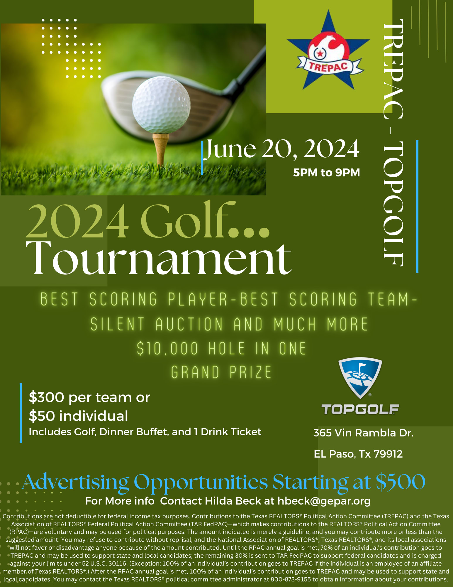 Registration for this event is temporarily closed, but not sold out yet, it will open up again on Monday, June 17th. If you want to register a team, please call Hilda on Monday at (915) 783-6072, or email hbeck@gepar.org.